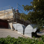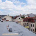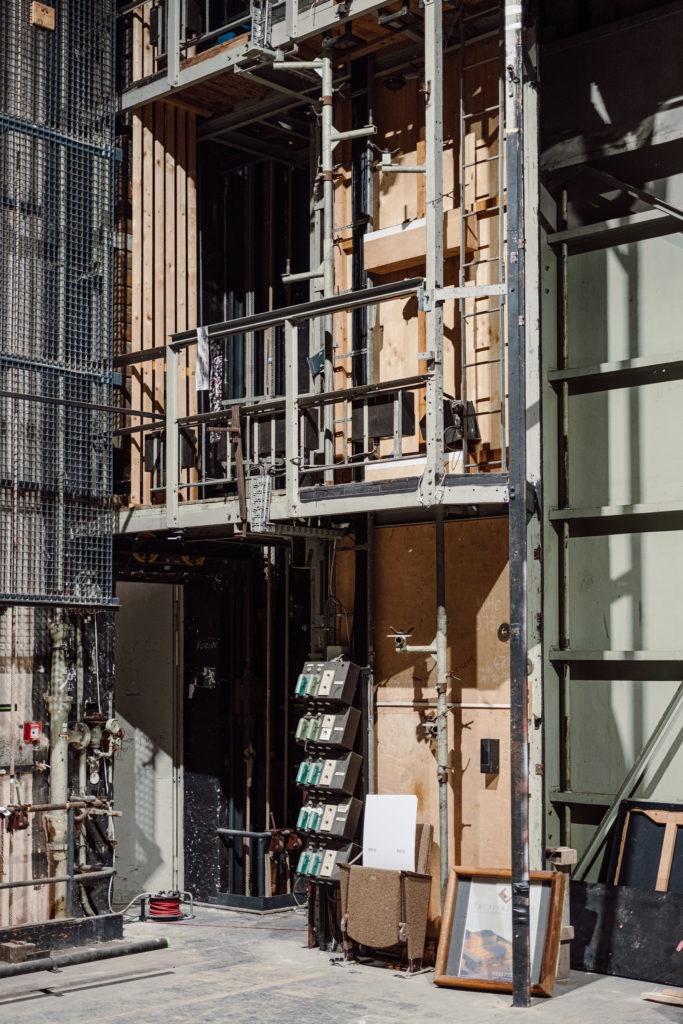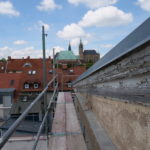 Seit Kalenderwoche 20 ist nun auch der Bühnenturm des KulturQuartier Schauspielhauses eingerüstet. Ein weiteres Baugerüst der Firma Josef Grund ermöglicht den Zugang für die Dachdecker der Firma Michael Diehl.Bedachungen. Sie haben inzwischen mit der Dachabdichtung durch Kunststoffbahnen begonnen und bringen parallel die Dachdämmung für den thermischen Schutz auf. Entlang des Bühnenturms ergeben sich dadurch spannende neue Einblicke in Bereiche, die normalerweise verborgen bleiben.
