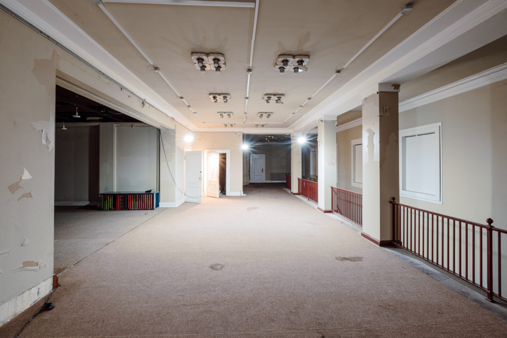 Ähnlich sieht es in den zukünftigen Kinosälen im 1. Obergeschoss aus: Der Bestand wird umfassend für die neue Nutzung als Kinobereich umgebaut. Die Abbruchfirma BAC hat auch hier Zwischendecken, Zwischenwände und Bodenbeläge entfernt.