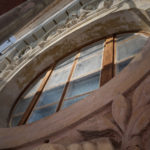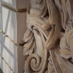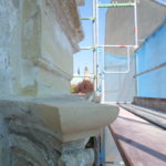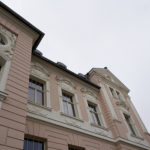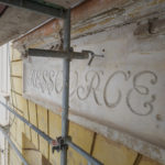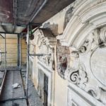 Mit großer Sorgfalt hat der Stuckateur die historischen Stuckelemente an der Straßenfassade rekonstruiert. In rund sieben Metern Höhe werden die Risse in den dreiteiligen Stuckprofilen derzeit mit einer Sandsteinersatzmasse ausgeglichen. Risalite, Bandrustika und weitere Schmuckdetails erstrahlen nun wieder in ihrer ursprünglichen Gestaltung und verleihen dem Gebäude seinen charakteristischen Ausdruck zurück.