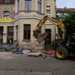 Vor dem Haus finden weiterhin Tiefbauarbeiten der Firma Prolixbau GmbH statt. Die Deckenplatte wurde zurückgebaut, die perforierten Betonschichten wurden bis zu den Kellerwänden freigelegt. In Anschluss erfolgten Ausmauerungsarbeiten und nun Grundierung und das Aufbringen einer Sperrschicht, die das Eindringen von Wasser vund Feuchtigkeit jeglicher Art verhindert.