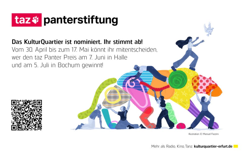 Der Preis der Tageszeitung taz ehrt Menschen und Initiativen, die sich mit Mut, Kreativität und Haltung für gesellschaftlichen Wandel engagieren. Dass wir als KulturQuartier dazu gehören dürfen, verdanken wir unserer starken Gemeinschaft – bestehend aus Unterstützer:innen, Mitstreiter:innen, Weggefährt:innen und vielen Engagierten!