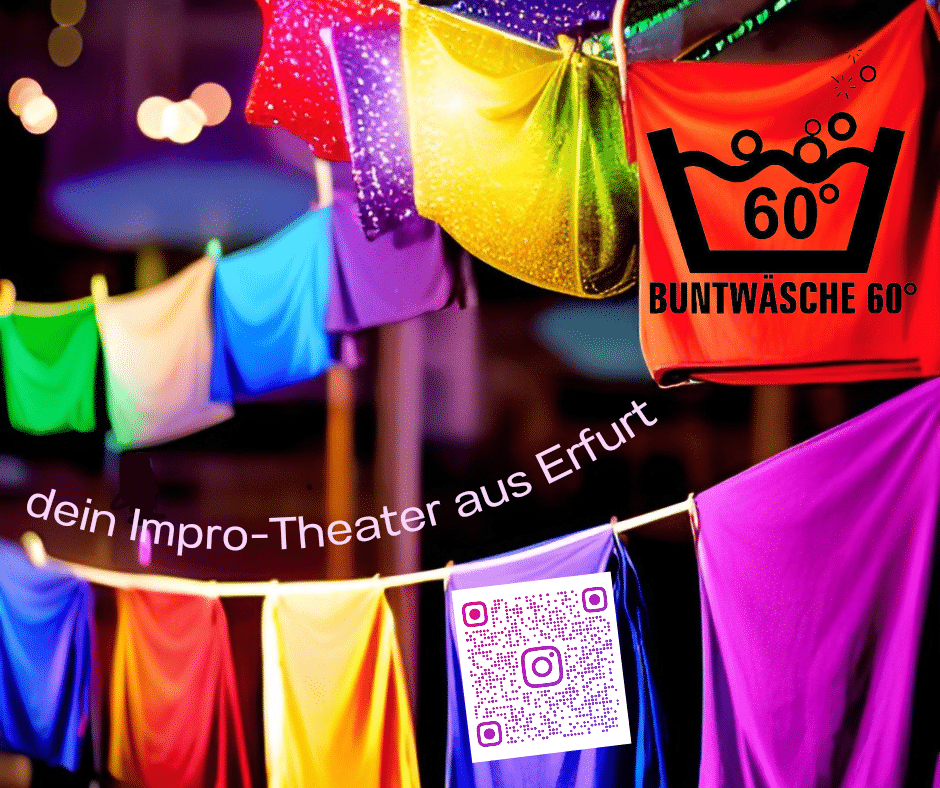 Buntwäsche 60 Grad ist Deine Improtheatergruppe aus Erfurt. Im Rahmen des KulturStand.Fests präsentieren wir uns mit einer Auswahl an Spielen, bei denen Du als Teil des Publikums aktiv Einfluss auf die Szene nehmen und mitbestimmen kannst.