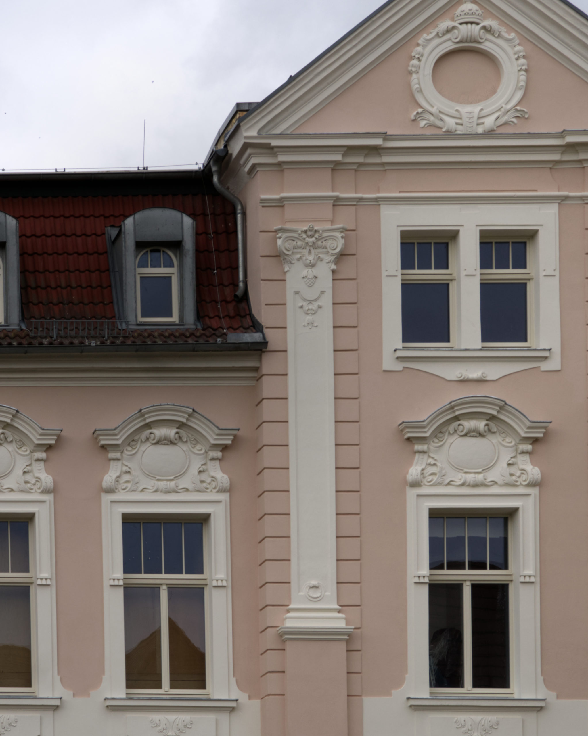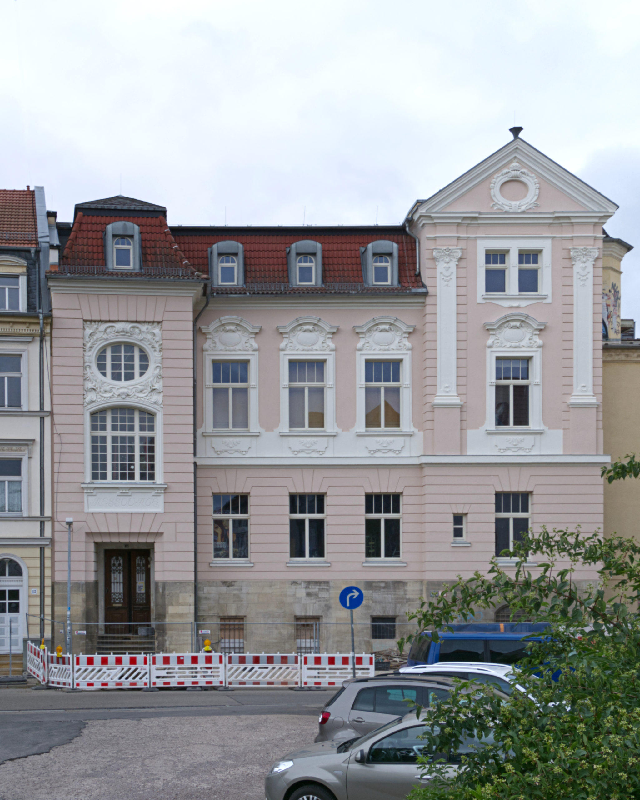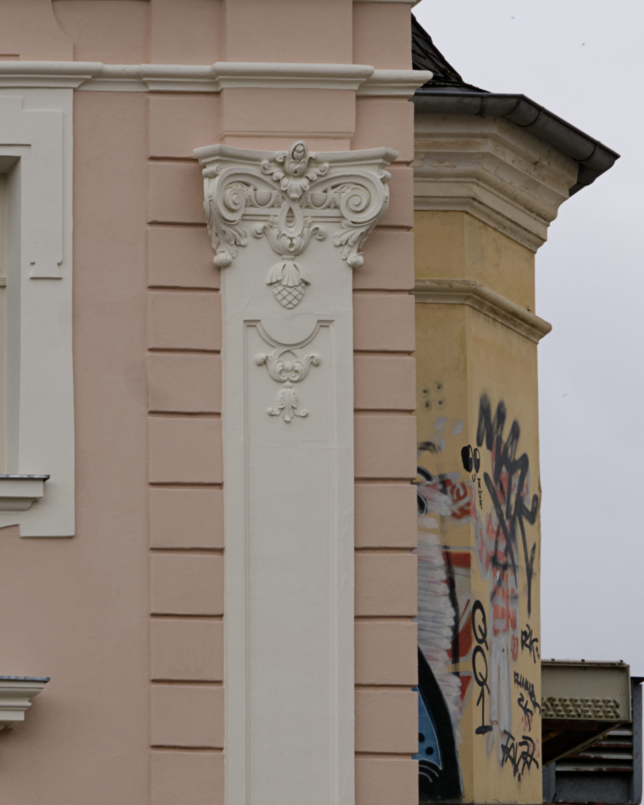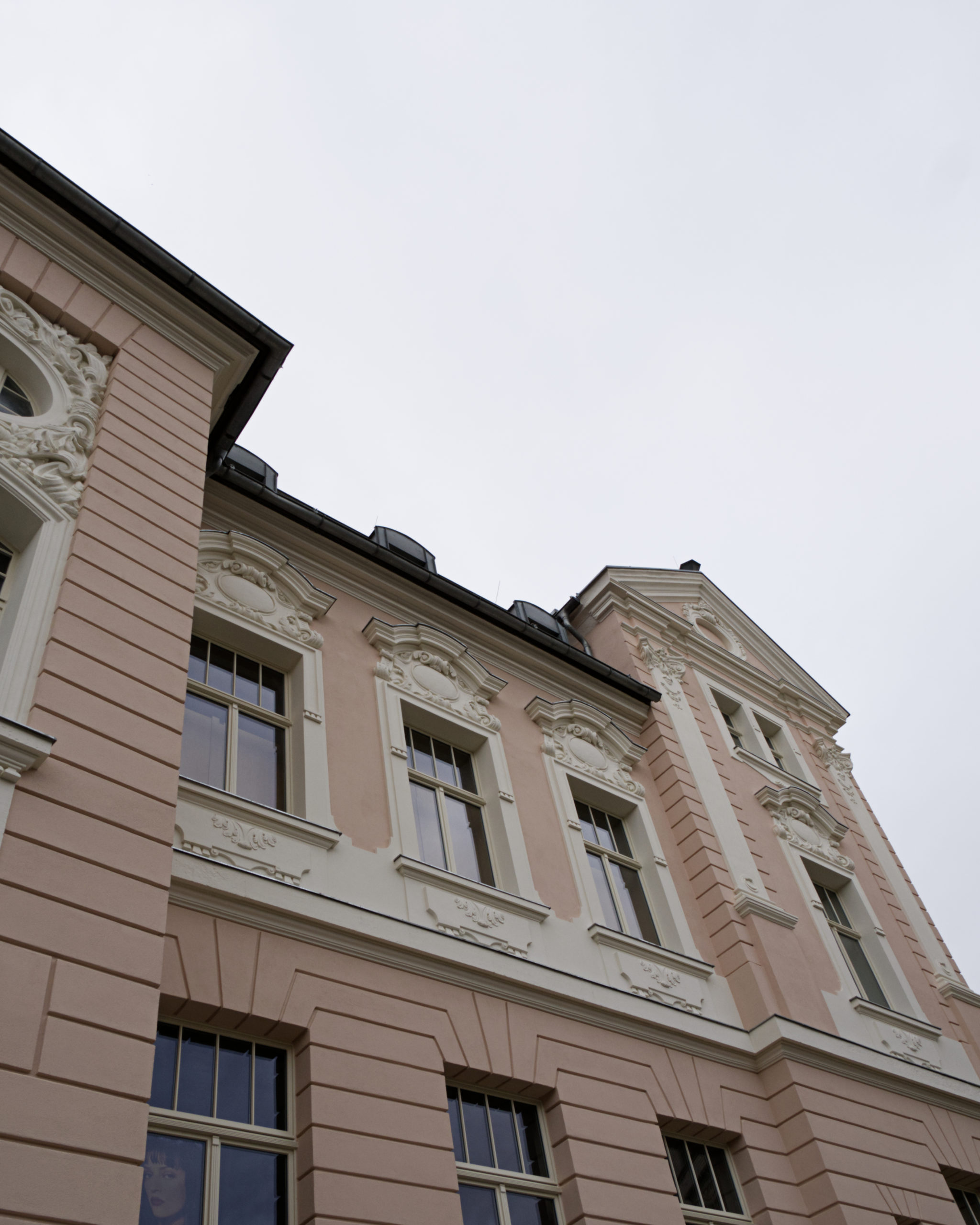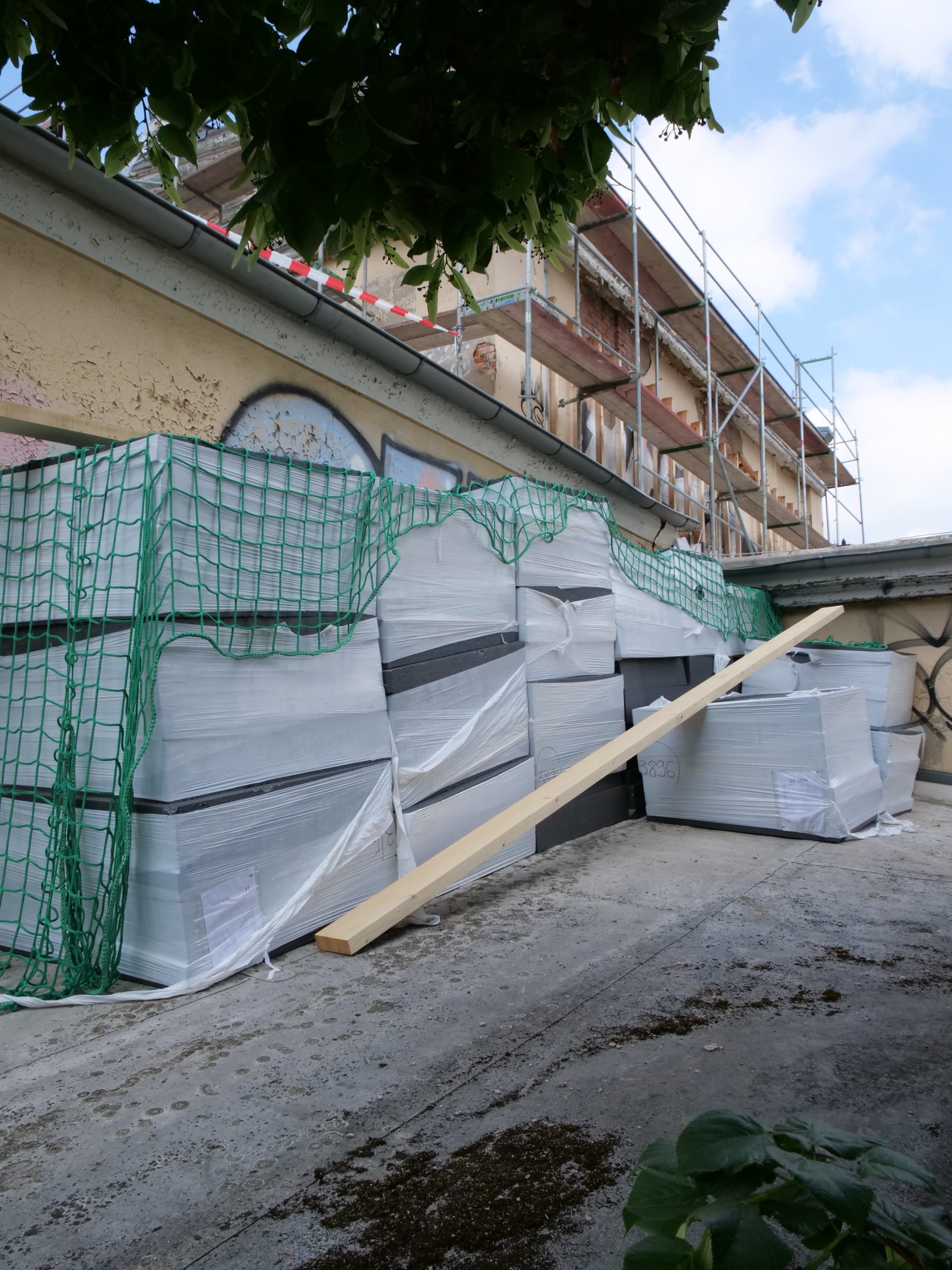 In der Lilienstraße ist die neue (ursprüngliche) Fassadenfarbe zu erkennen – sie schimmert durch das Gerüst. In den nächsten Tagen wird dieses entfernt, und die fertige Fassade mit restauriertem Stuck und Bossierung wird in voller Pracht erstrahlen.
