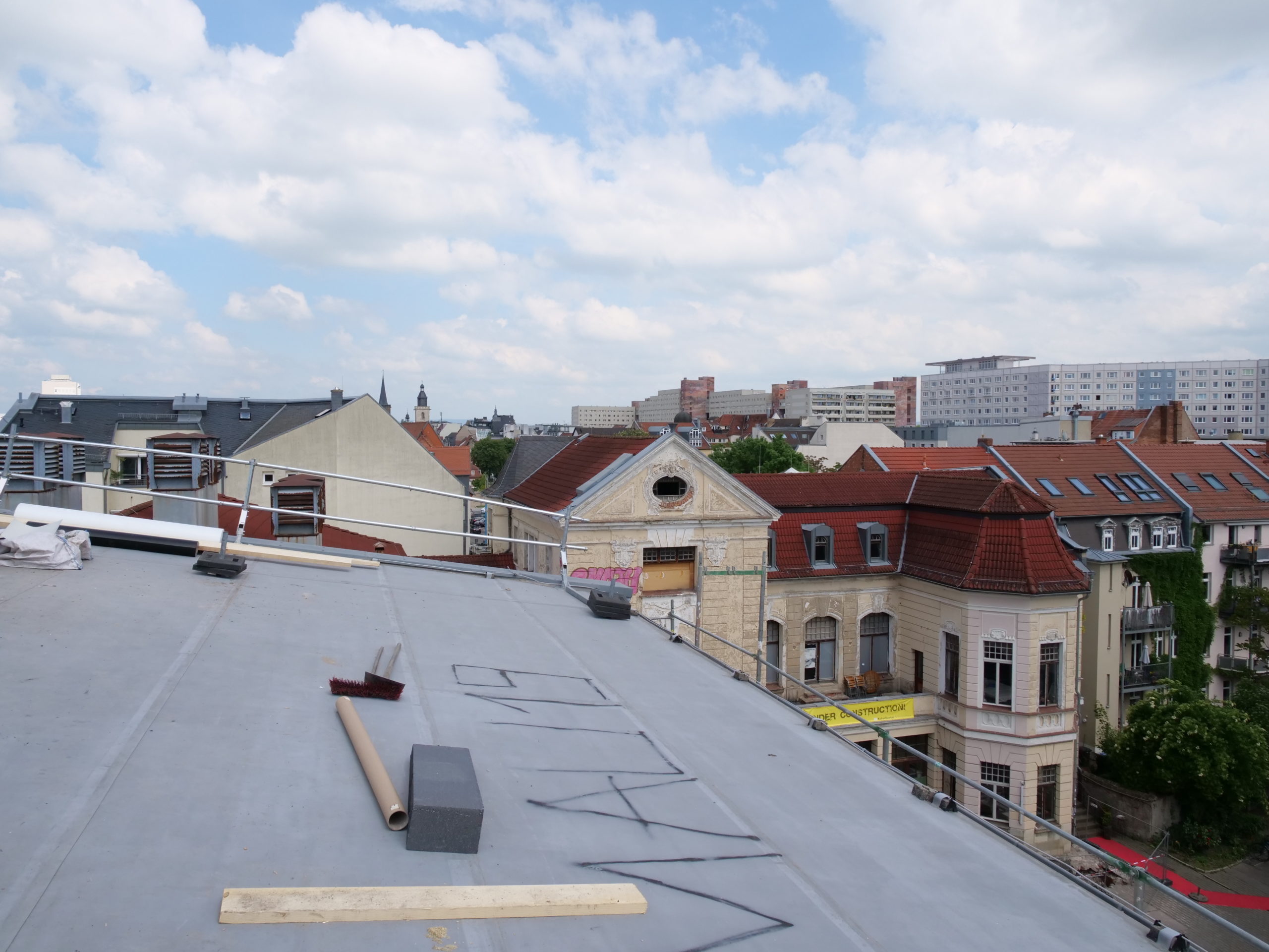 Die Dachabdichtung und Dämmung im Bereich des Bühnenturms sind abgeschlossen. Außerdem wurden Sekuranten (Anschlagpunkte für das Absturzsicherungssystem) montiert. Die sogenannten Sekuranten ermöglichen sicheres Arbeiten auf dem Dach und sind bei Arbeiten in großer Höhe gesetzlich vorgeschrieben.