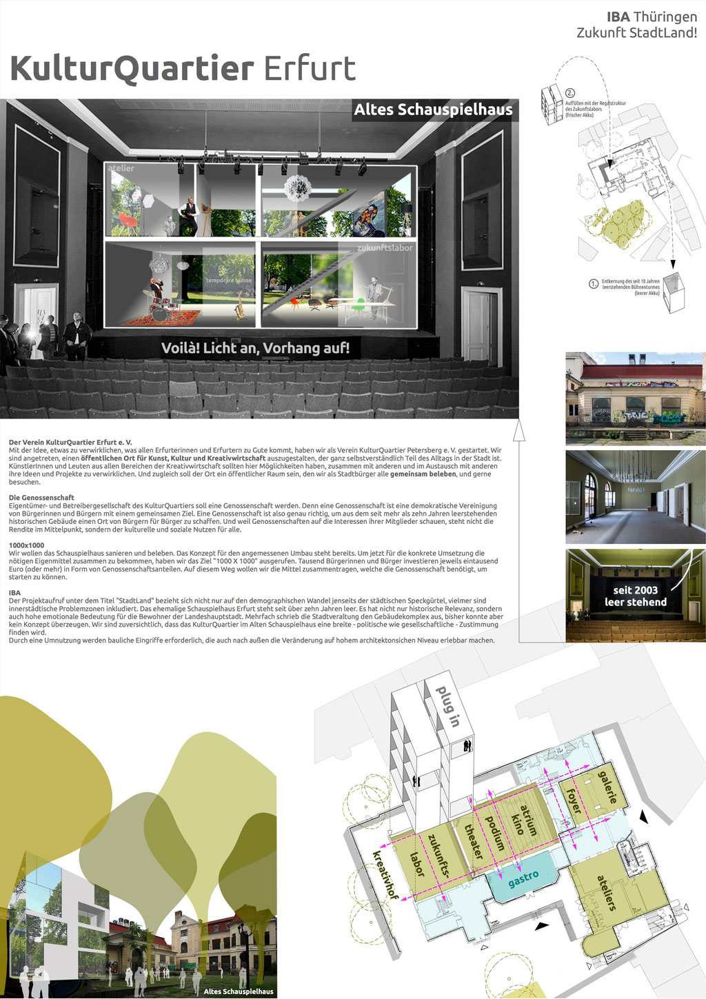 Der Projektaufruf unter dem Titel „StadtLand“ bezieht sich nicht nur auf den demographischen Wandel jenseits der städtischen Speckgürtel, vielmer sind innerstädtische Problemzonen inkludiert. Das ehemalige Schauspielhaus Erfurt steht seit über zehn Jahren leer. Es hat nicht nur historische Relevanz, sondern auch hohe emotionale Bedeutung für die Bewohner der Landeshauptstadt. Mehrfach schrieb die Stadtveraltung den Gebäudekomplex aus, bisher konnte aber kein Konzept überzeugen. Wir sind zuversichtlich, dass das KulturQuartier im Alten Schauspielhaus eine breite – politische wie gesellschaftliche – Zustimmung „nden wird.Durch eine Umnutzung werden bauliche Eingri!e erforderlich, die auch nach außen die Veränderung auf hohem architektonsichen Niveau erlebbar machen.