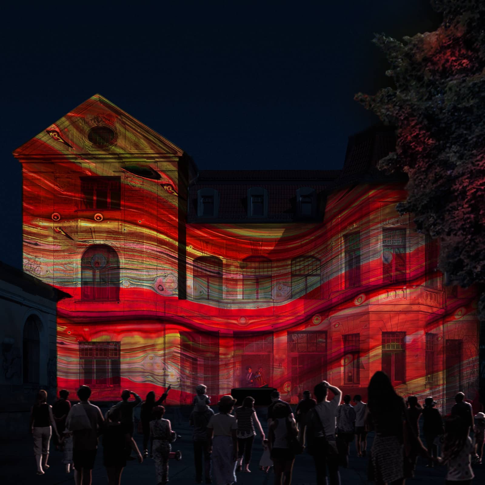 Für das Kulturquartier Erfurt präsentiert Lea Brugnoli ein Live-Projektionsmapping auf der Fassade des KulturQuartier Schauspielhaus. Bewegte Bilder reagieren live auf die Musik der Weimarer Band