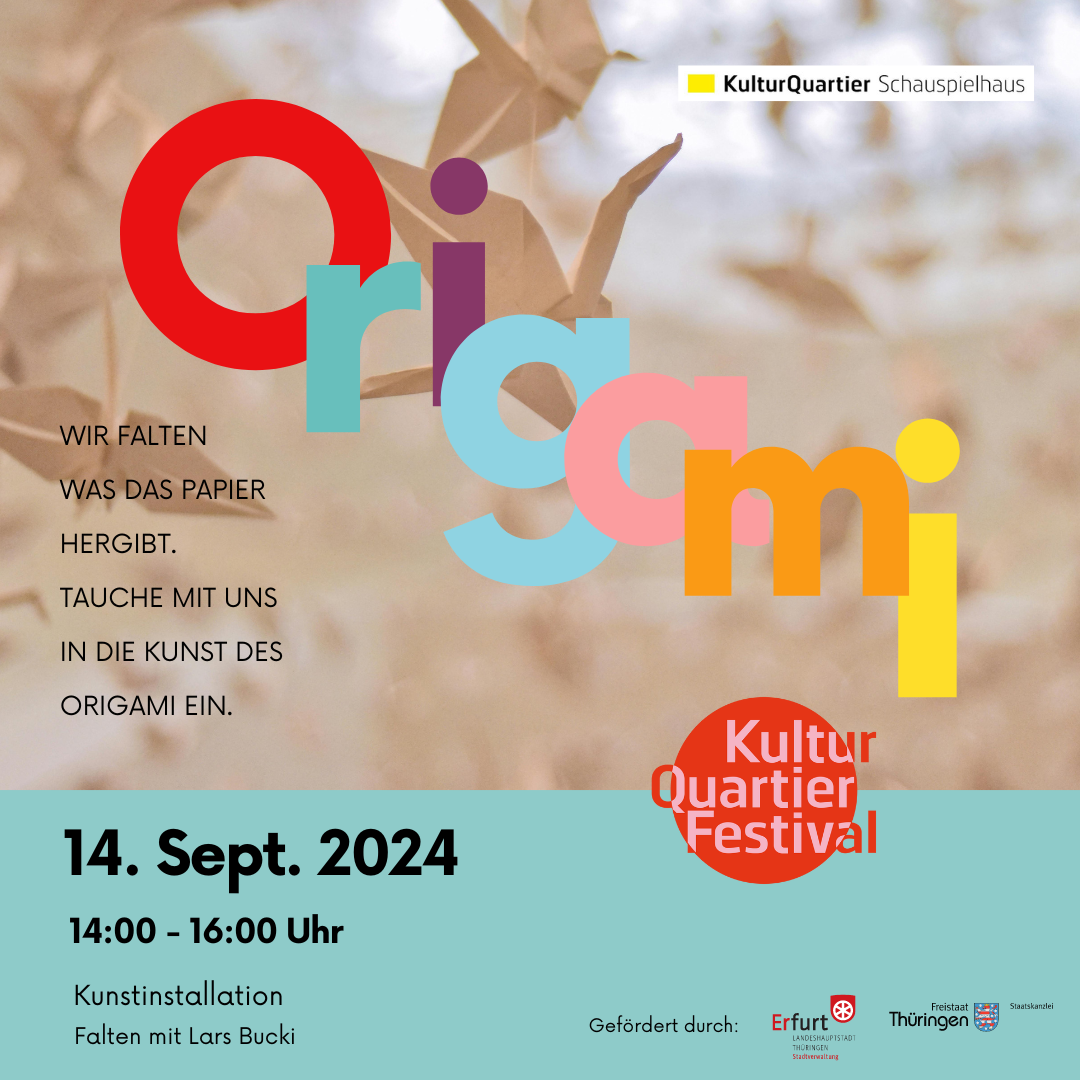 KOMMt vorbei, taucht mit dem Erfurter Künstler Lars Bucki in die Welt des Origami ein und lasst Euch vom Ergebnis überraschen. Wir falten, was das Papier hergibt. Tauche mit uns