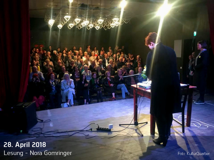 Nora Gomringer stellt ihre Gedichte und Sprechtexte vor, das bedeutet sie liest nicht nur Texte von 2006 bis heute, sondern sie deklamiert, flüstert und lässt die Mini-Szenen, die diesen Texten zugrunde liegen, durch Mundwerk erstehen. Das ist lebhaft und wundersam, manchmal traurig, aber gut dynamisiert, damit keiner weggeht und sagt: „Lyrik? Ertrag ich nicht!“ Ihre Mission ist die zarte Begegnung mit dem harten Leben. In Zwischenkommentaren erklärt sie ihre Arbeit und öffnet Türen. Über die Schwelle trägt sie allerdings nicht. Das ist nicht schlimm – so können Sie wenigstens die Schuhe anbehalten!