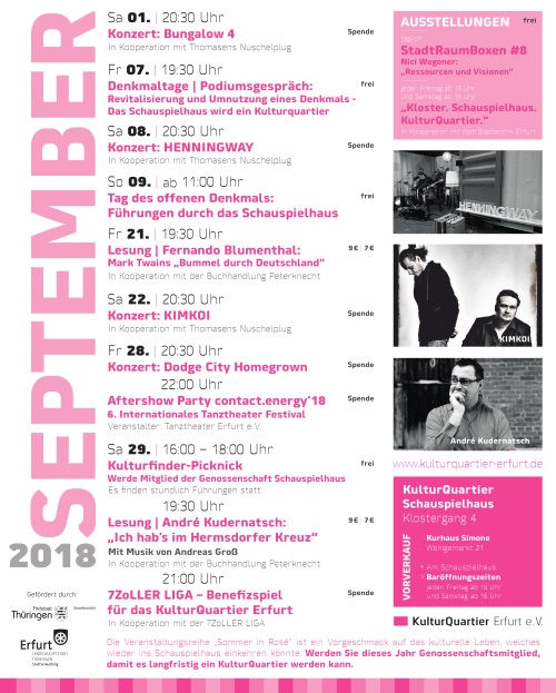 Am Freitag, dem 7. September, findet im Großen Saal des KulturQuartiers Schauspielhaus die Podiumsdiskussion „Revitalisierung und Umnutzung eines Denkmals – Das Schauspielhaus wird ein KulturQuartier“ mit Mark Escherich von der Bauhaus-Universität Weimar, Anne Palmowski vom Stadtarchiv Erfurt und dem Architekten Thomas Schmidt vom KulturQuartier Erfurt e.V. statt.