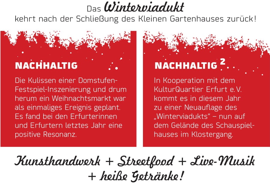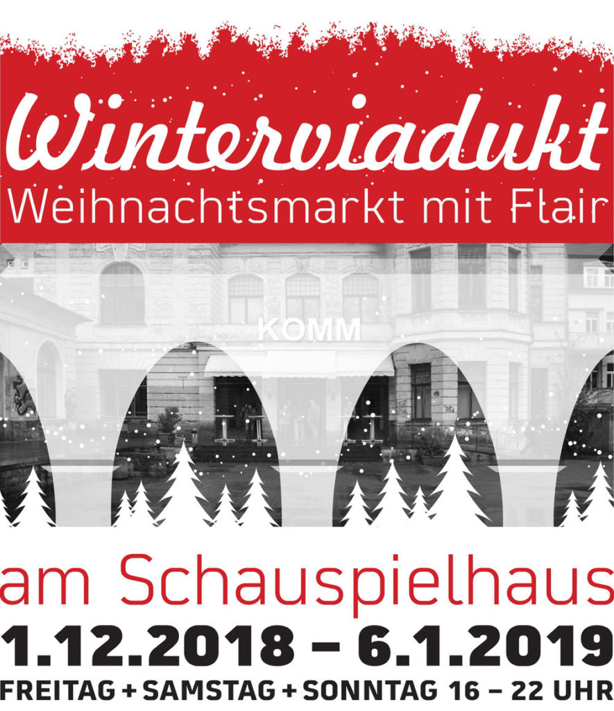 Vom 1. Dezember 2018 bis zum 6. Januar 2019 ist der Weihnachtsmarkt „Winterviadukt“ jeden Freitag, Samstag und Sonntag jeweils von 16 bis 22 Uhr geöffnet. Neben der einzigartigen Atmosphäre erwartet die Besucher ein bunter Mix aus Kunsthandwerk, internationalem Streetfood, Live-Musik – und natürlich Glühwein und Punsch!