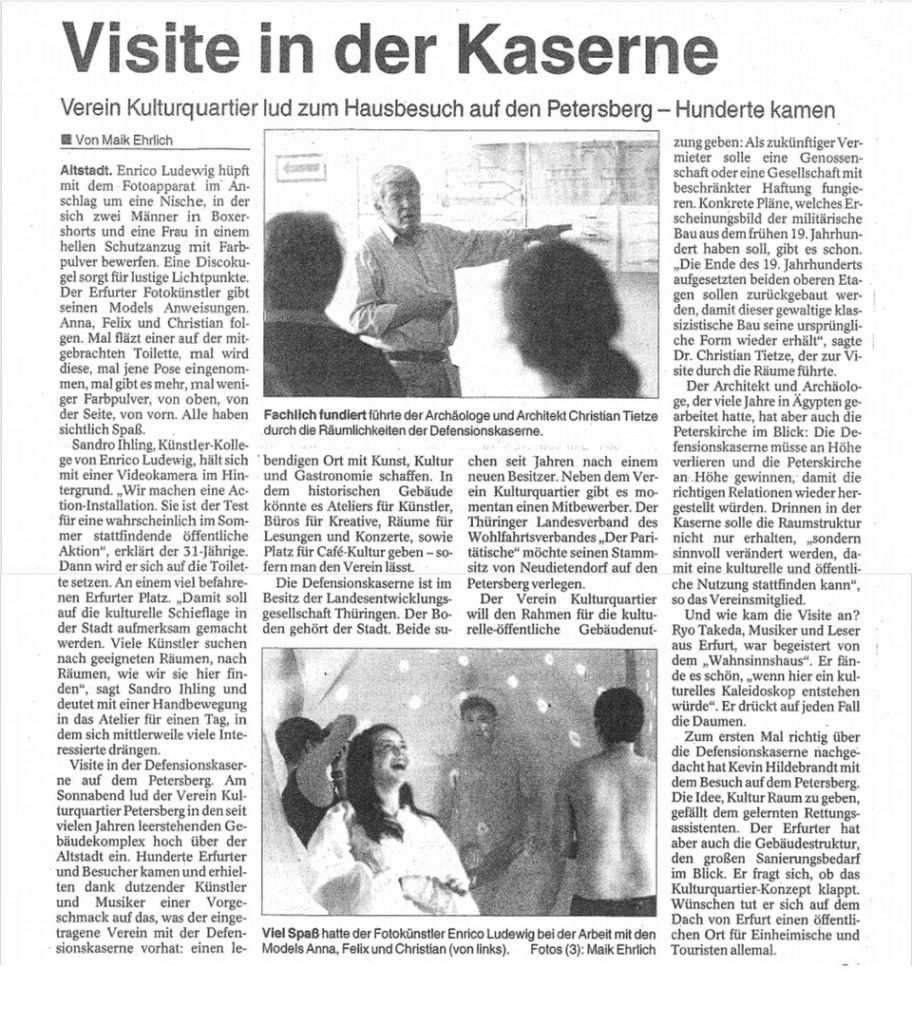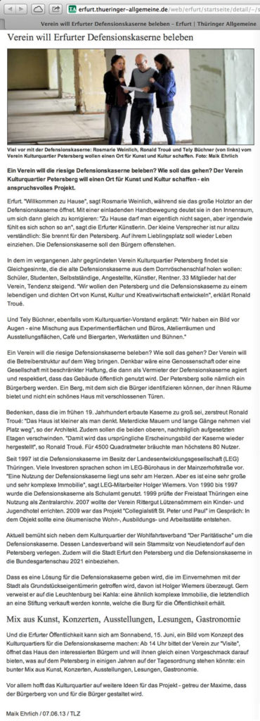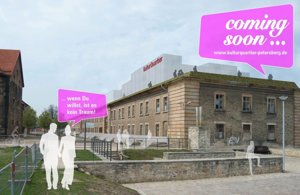 Mit der Idee, etwas zu verwirklichen, was allen Erfurterinnen und Erfurtern zu Gute kommt, sind wir als Verein KulturQuartier Petersberg e.V. ja gestartet. Wir sind angetreten, die Defensionskaserne zu einem öffentlichen Ort von Kunst, Kultur und Kreativwirtschaft auszugestalten, der ganz selbstverständlich Teil des Alltags in der Stadt ist. Künstlerinnen und Leuten aus allen Bereichen der Kreativwirtschaft sollen hier Möglichkeiten haben, zusammen mit anderen und im Austausch mit anderen ihre Ideen und Projekte zu verwirklichen. Und zugleich soll der Ort und soll die Kaserne ein öffentlicher Raum sein, den wir als Stadtbürgerinnen und –bürger alle gemeinsam beleben, zum Flanieren nutzen und gerne besuchen.