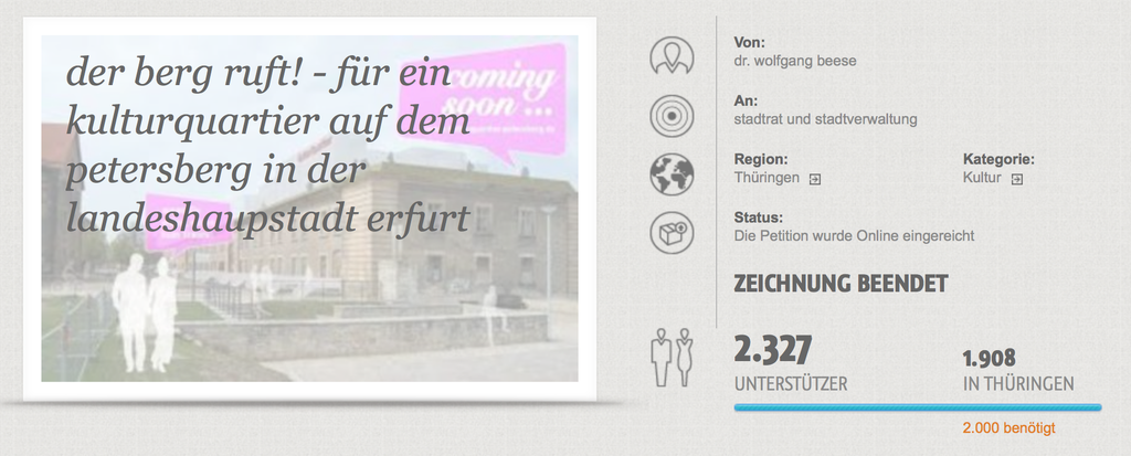 Dr. Wolgang Beese (SPD-Stadtrat und Vorsitzender des Erfurter Kultuausschusses) hat im März 2014 eine Petition gestartet. Empfänger sind die Stadträte und die Verwaltung der Stadt Erfurt.