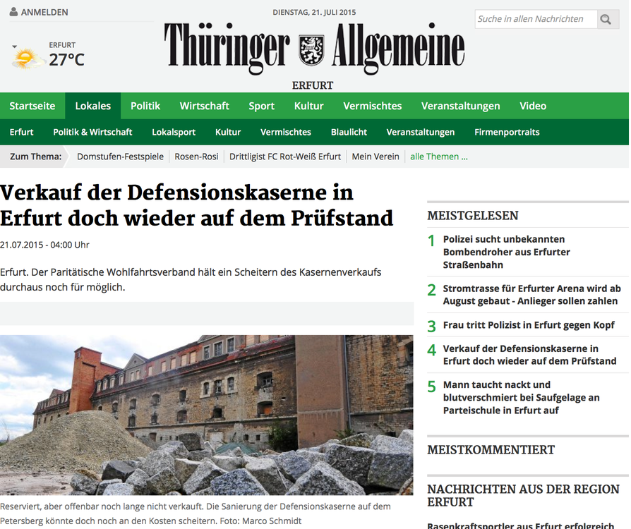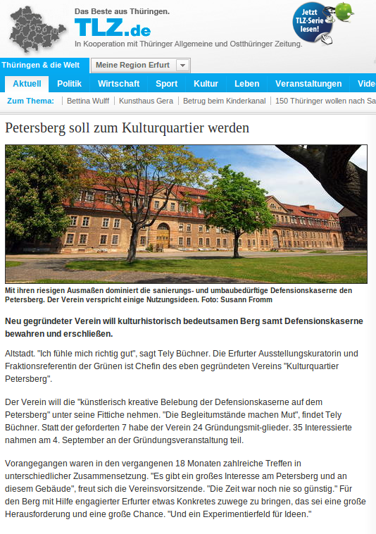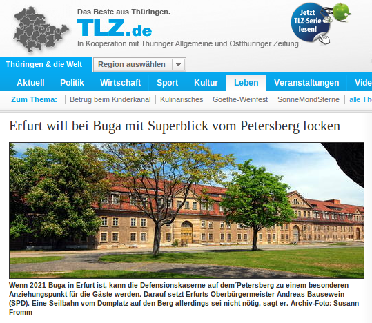 „Erfurt. Die Grundsatzentscheidung über ein Konzept für die Defensionskaserne auf der Zitadelle Petersberg wurde erneut vertagt. Oberbürgermeister Andreas Bausewein (SPD) soll konkurrierende Anbieter an einen Tisch bringen.“ ..mehr auf der Internetseite der TA